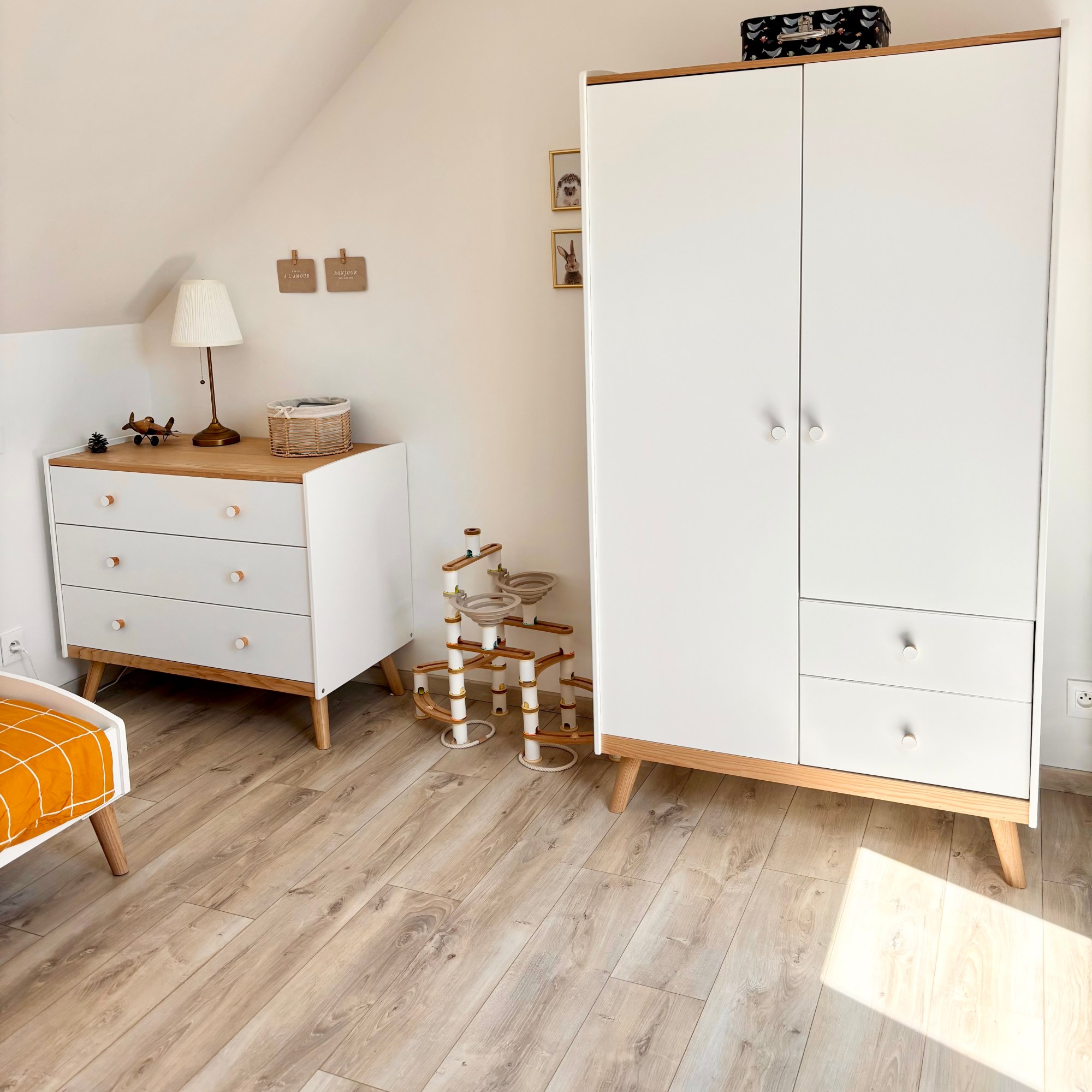 - Commode à plusieurs tiroirs : Pour ranger les vêtements, les jouets, ou même les livres. Le plus : les tiroirs permettent de classer par catégorie et de garder un espace ordonné.